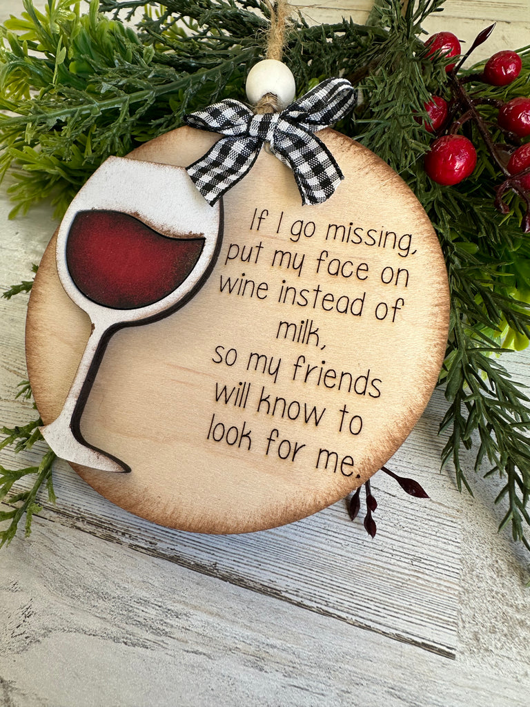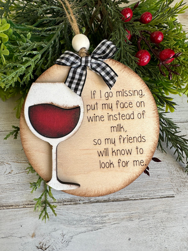 Because let’s be honest — your friends aren’t finding you in a dairy aisle. This hand-painted wooden ornament says what we’re all thinking: “If I go missing, put my face on wine instead of milk, so my friends will know to look for me.”